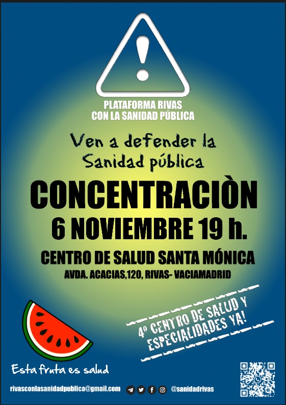 La Plataforma Rivas por la Sanidad Pública os convoca a una concentración ciudadana para exigir la apertura inmediata y con recursos del cuarto centro de salud en el barrio de La Luna.