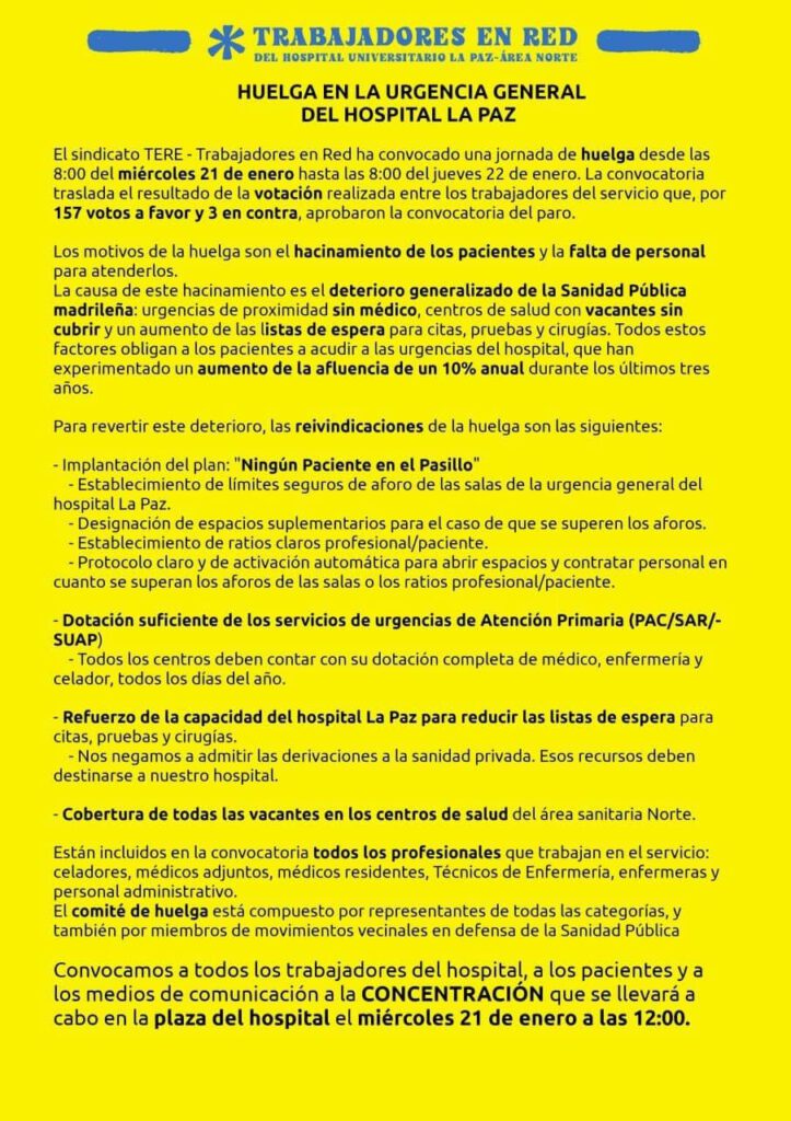 📢 El personal de urgencias del Hospital La Paz convoca huelga desde las 8:00 h del miércoles 21 de enero hasta las 8:00 h del jueves 22, ante la saturación del servicio, la falta de personal y el deterioro de la sanidad pública. Exigen ratios seguras, espacios adecuados y cobertura de vacantes.