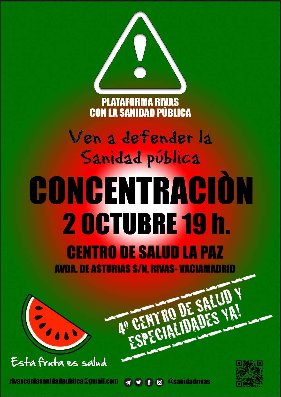 📣 Concentración por la Sanidad Pública 🗓 2 de octubre 🕖 19:00 h 📍 Centro de Salud La Paz – Avda. de Asturias s/n, Rivas-Vaciamadrid