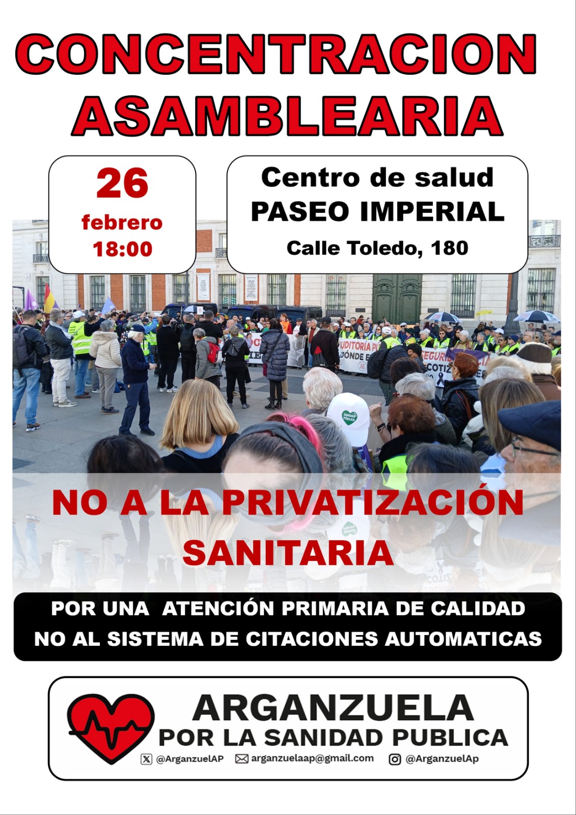 📆 El jueves26 de febrero⌚ a las 18 horas nos reunimos en el Centro Social Paseo Imperial 📍calle Toledo 180 en una concentración asamblearia abierta a todo el barrio.