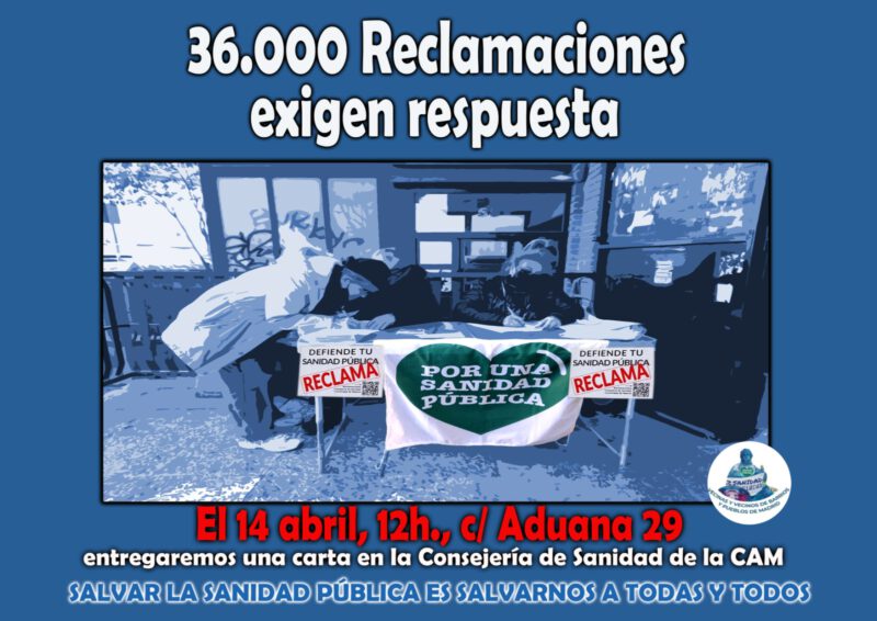 Vecinas y vecinos de los barrios y pueblos de Madrid nos personaremos mañana, martes 14 de abril a las 12:00 h, en la Consejería de Sanidad (C/ Aduana 29) para entregar un escrito exigiendo respuesta a las más de 36.000 reclamaciones presentadas por usuarias y usuarios de la sanidad pública ante la nefasta gestión del sistema sanitario madrileño.