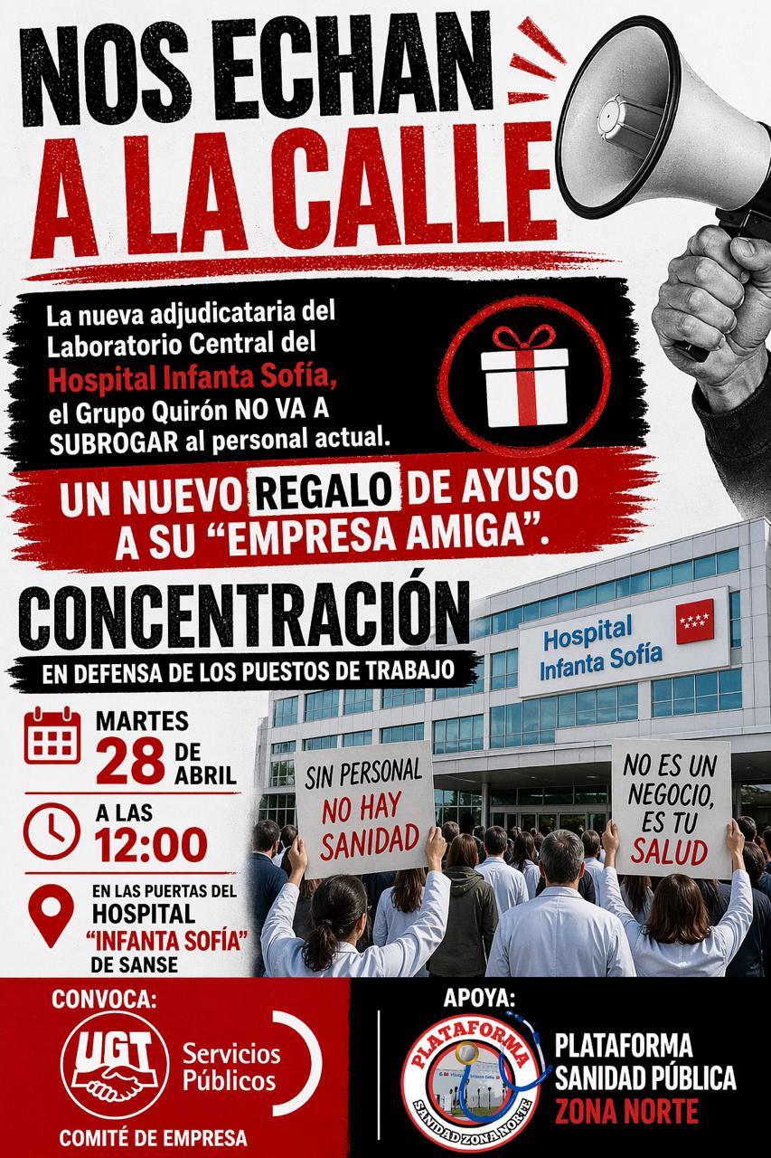 La plantilla del laboratorio central del Hospital Infanta Sofía denuncia una decisión que consideran gravísima: la privatización del laboratorio y su entrega nuevamente a la empresa Quirón, una compañía que ya gestiona otros servicios externalizados en la Comunidad de Madrid.