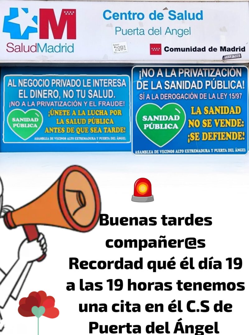 Las plataformas vecinales Alto Extremadura y Puerta del Ángel convocan una concentración para denunciar el desvío de dinero público hacia empresas privadas mientras se desmantela la sanidad pública madrileña.
