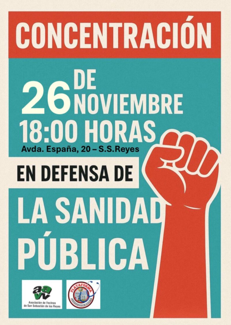 La Asociación de Vecinos de San Sebastián de los Reyes junto con la Plataforma Sanidad Zona Norte convocan una concentración en defensa de la sanidad pública.