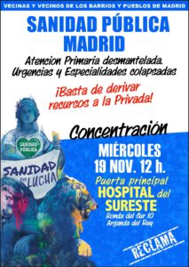 Nota de prensa | 12 diciembre 2024 Sanidad Pública: 14 de diciembre concentración vecinal en el nuevo Hospital 12 de Octubre y el 16 nueva entrega masiva de reclamaciones por Registro. Vecinas y vecinos de Barrios y Pueblos de Madrid, espacio que agrupa a decenas de...